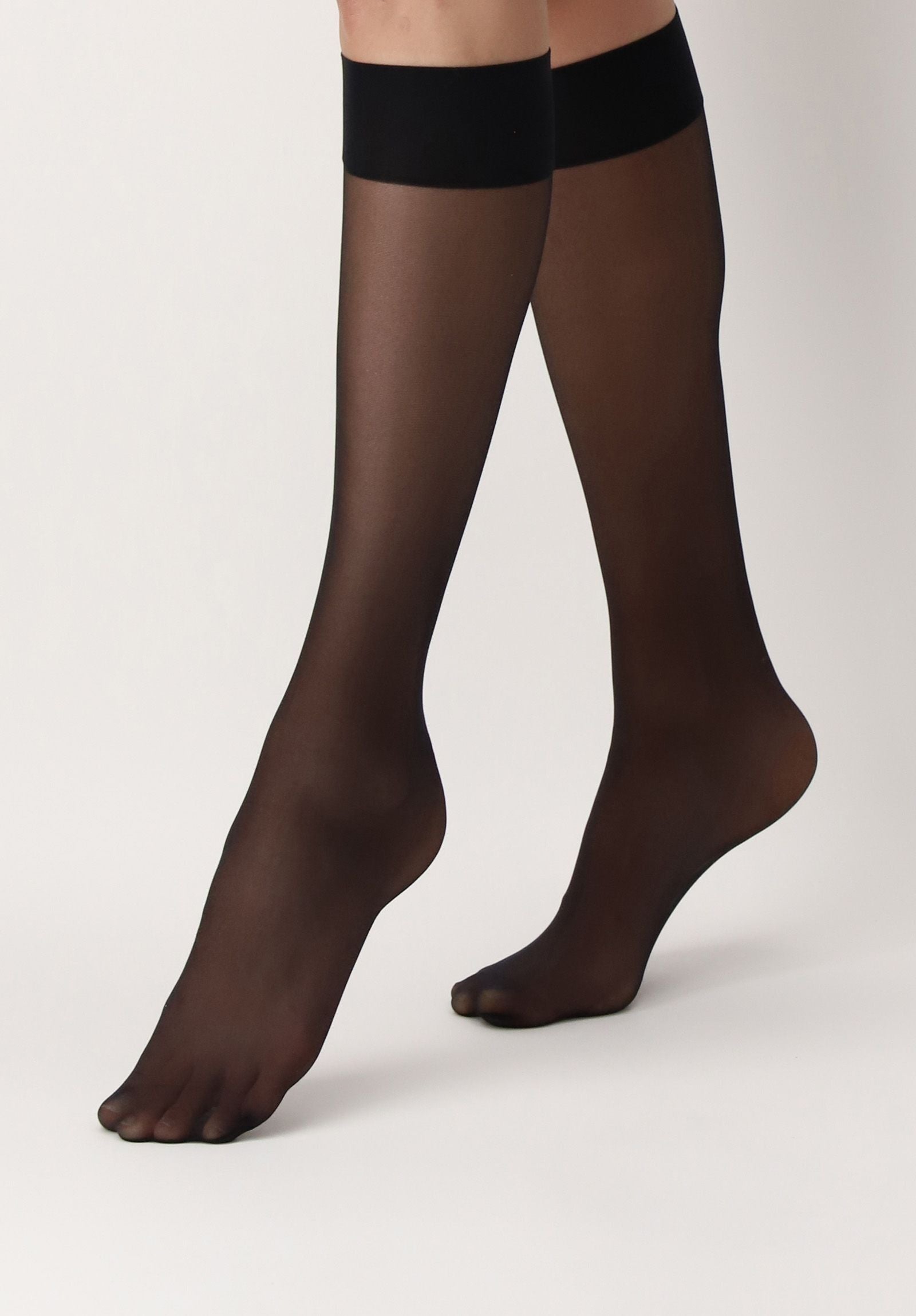 Sheer knee-highs in 20 deniers, with a very high and comfortable cuff, transparent on the leg and with an opaque appearance. The cuff (elastic at the calf) is higher than the normal Oroblù cuffs. It hugs the leg for greater stability, it does not go down and does not tighten thanks also to the use of high quality yarns. The tip is bare and lets the toes be veiled but visible. A care that makes the Dolcevita 20 knee-highs perfect for pointy shoes. Eliminates friction and lets you see the toes.
