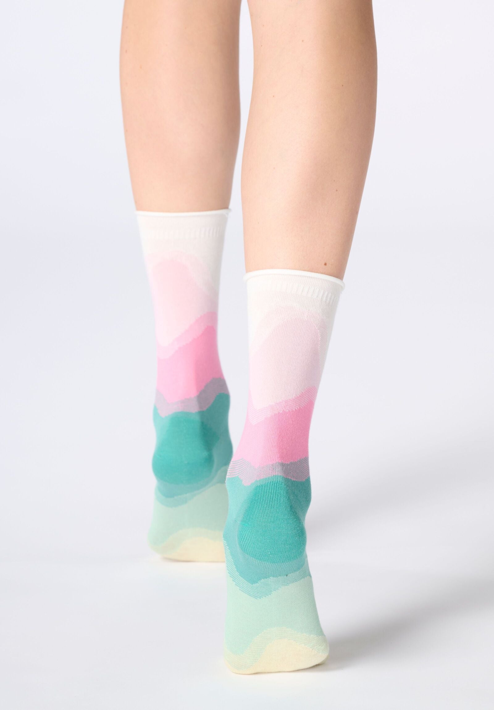 Soft cotton sock featuring a delicate wave pattern in pastel shades, designed to add a fresh, feminine touch to everyday looks. The raw-cut cuff ensures a clean line and a comfortable fit, while the flat, invisible stitched toe guarantees a flawless feel even in the lightest footwear. A versatile and refined detail, ideal for those who love accessories with a simple yet sophisticated design.