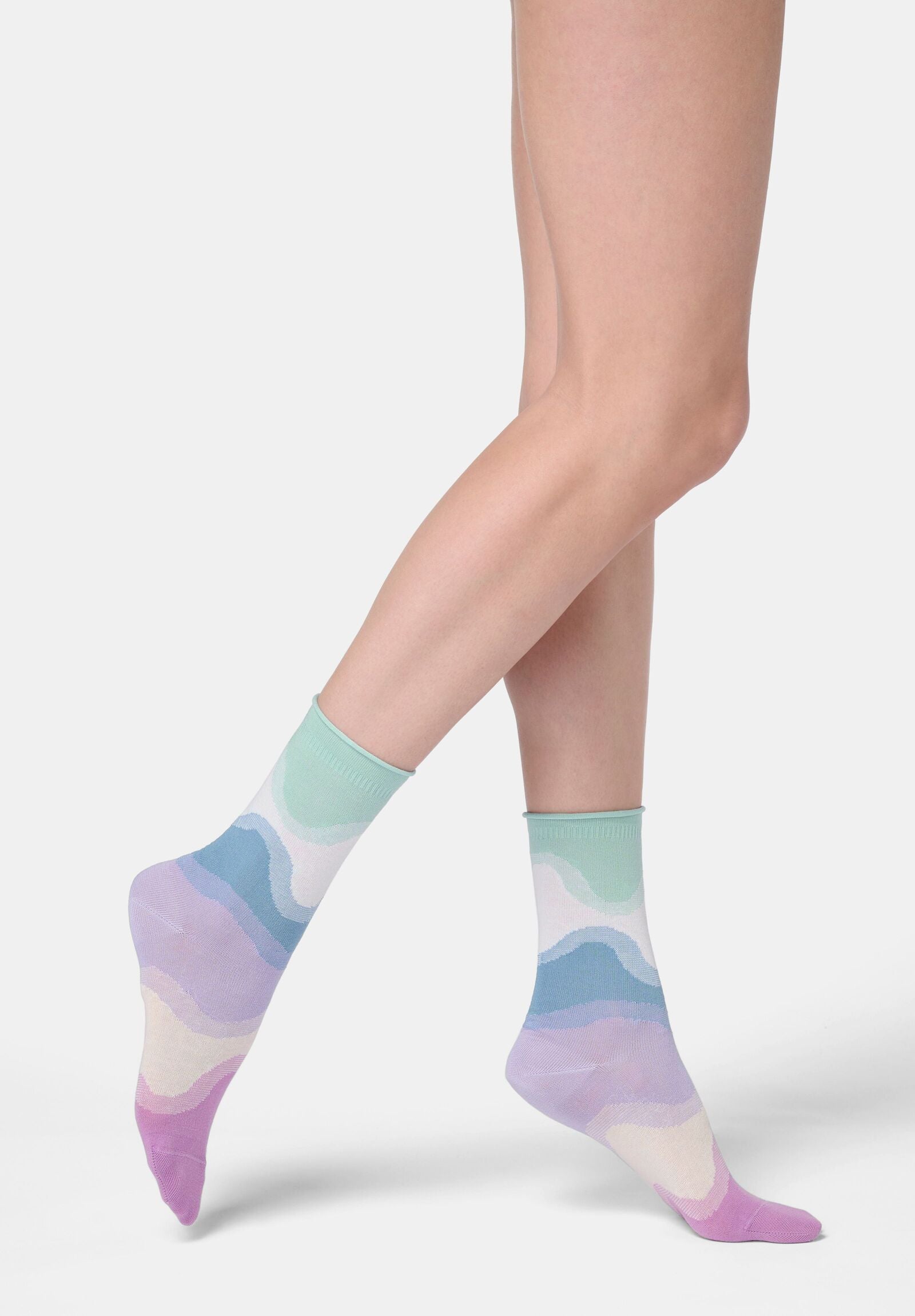 Soft cotton sock featuring a delicate wave pattern in pastel shades, designed to add a fresh, feminine touch to everyday looks. The raw-cut cuff ensures a clean line and a comfortable fit, while the flat, invisible stitched toe guarantees a flawless feel even in the lightest footwear. A versatile and refined detail, ideal for those who love accessories with a simple yet sophisticated design.