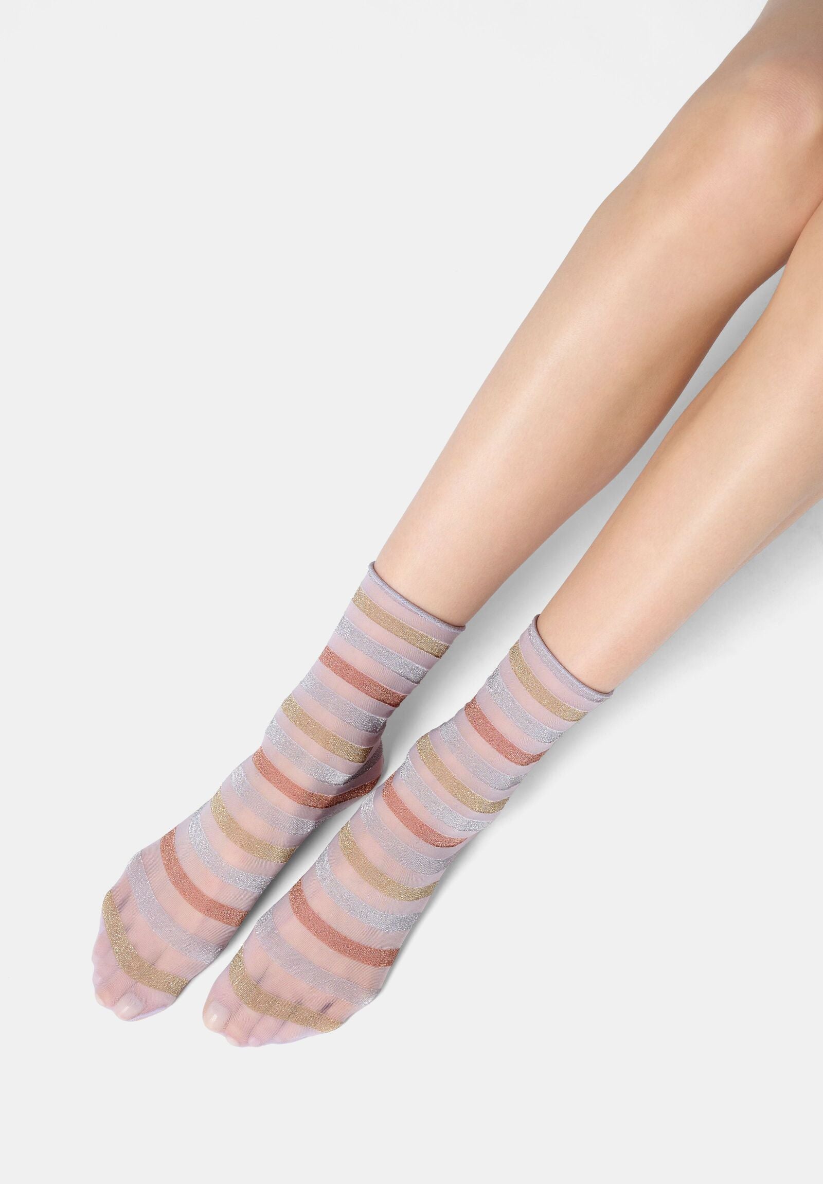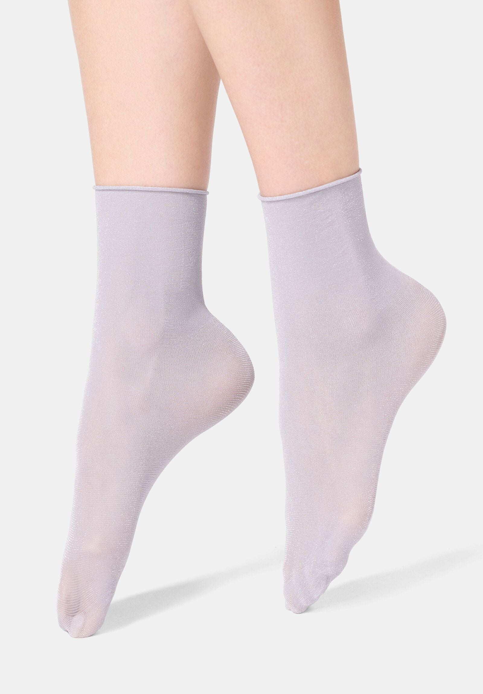 Les socquettes semi‑transparentes en bi‑pack, réalisées avec un fil lamé raffiné, apportent une touche lumineuse délicate à chaque tenue. Le bord coupé à vif assure un chaussant confortable et une ligne épurée, parfaite pour un style élégant au quotidien comme pour des occasions spéciales.
