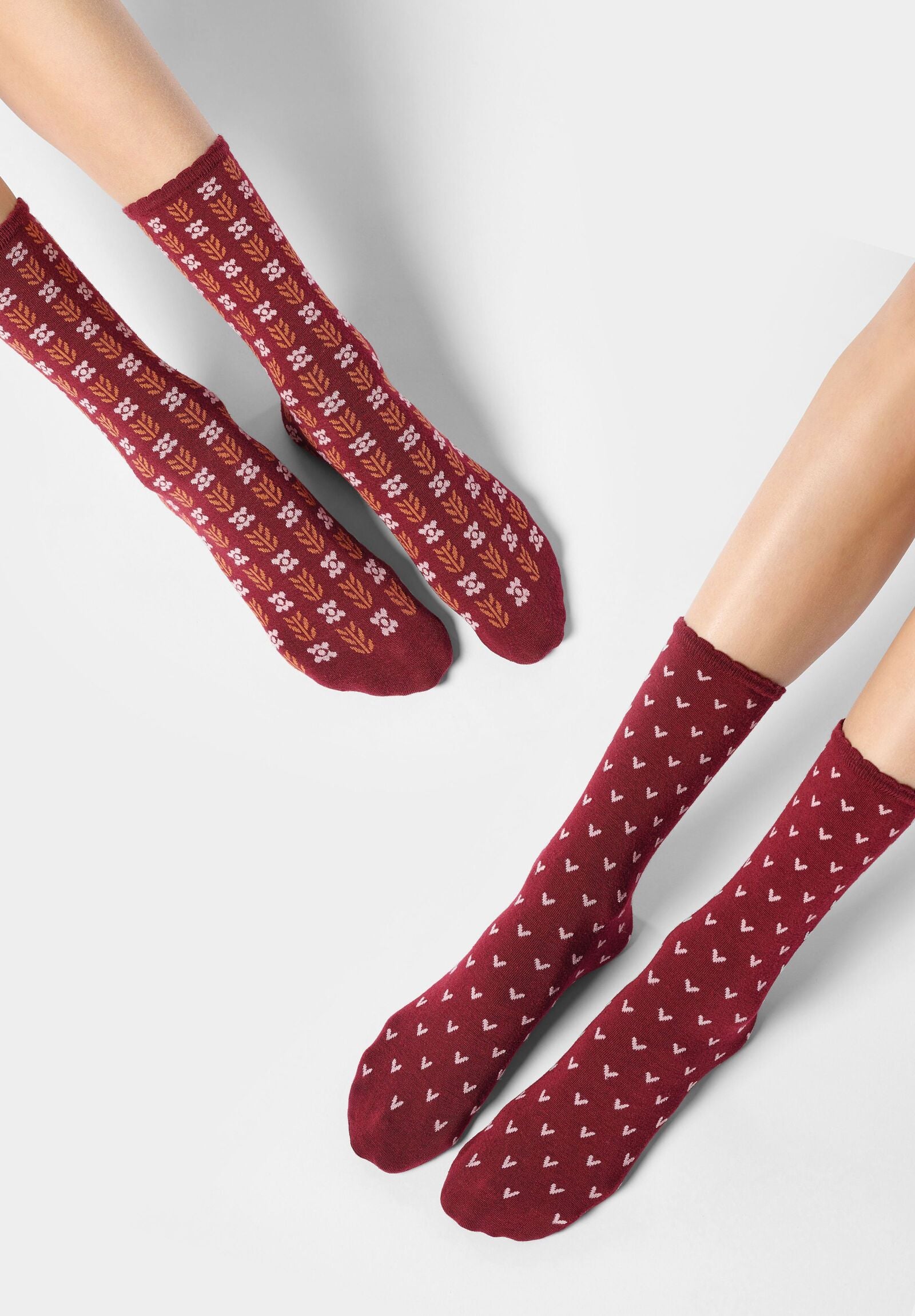 Calzini in viscosa venduti in bipack, proposti in due diverse fantasie. Il polsino con cappette aggiunge un dettaglio delicato e femminile. Morbidi e confortevoli, questi calzini sono ideali per completare il tuo look con stile e comfort, perfetti per ogni occasione quotidiana.