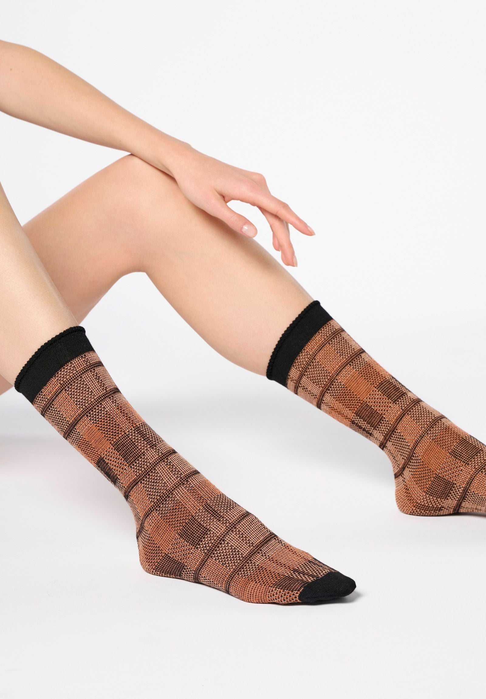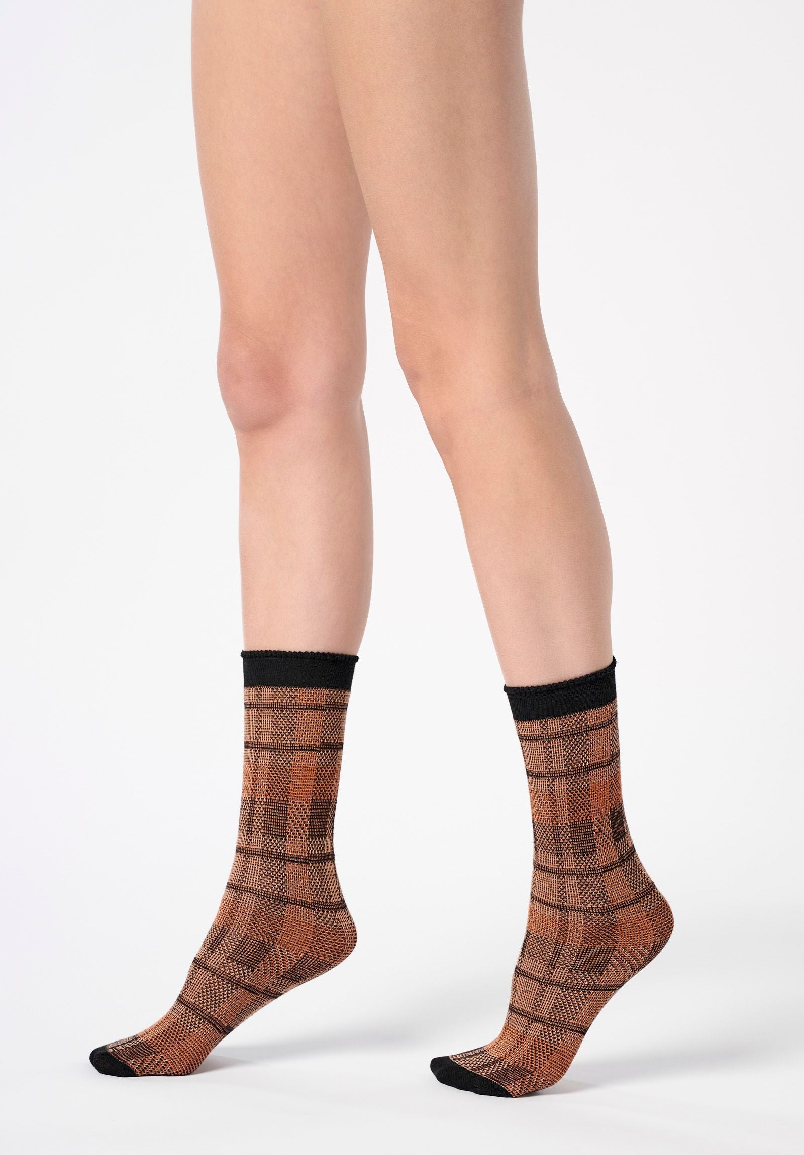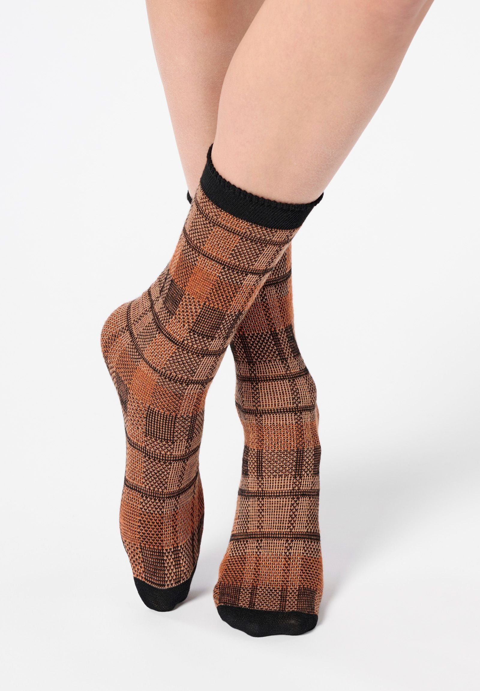 Calzino in morbida viscosa con elegante motivo tartan, perfetto per dare un tocco classico e originale al tuo outfit. Il polsino morbido assicura una tenuta confortevole senza segnare la gamba. Ideale per look autunnali e invernali, unisce stile e praticità con un design senza tempo.
