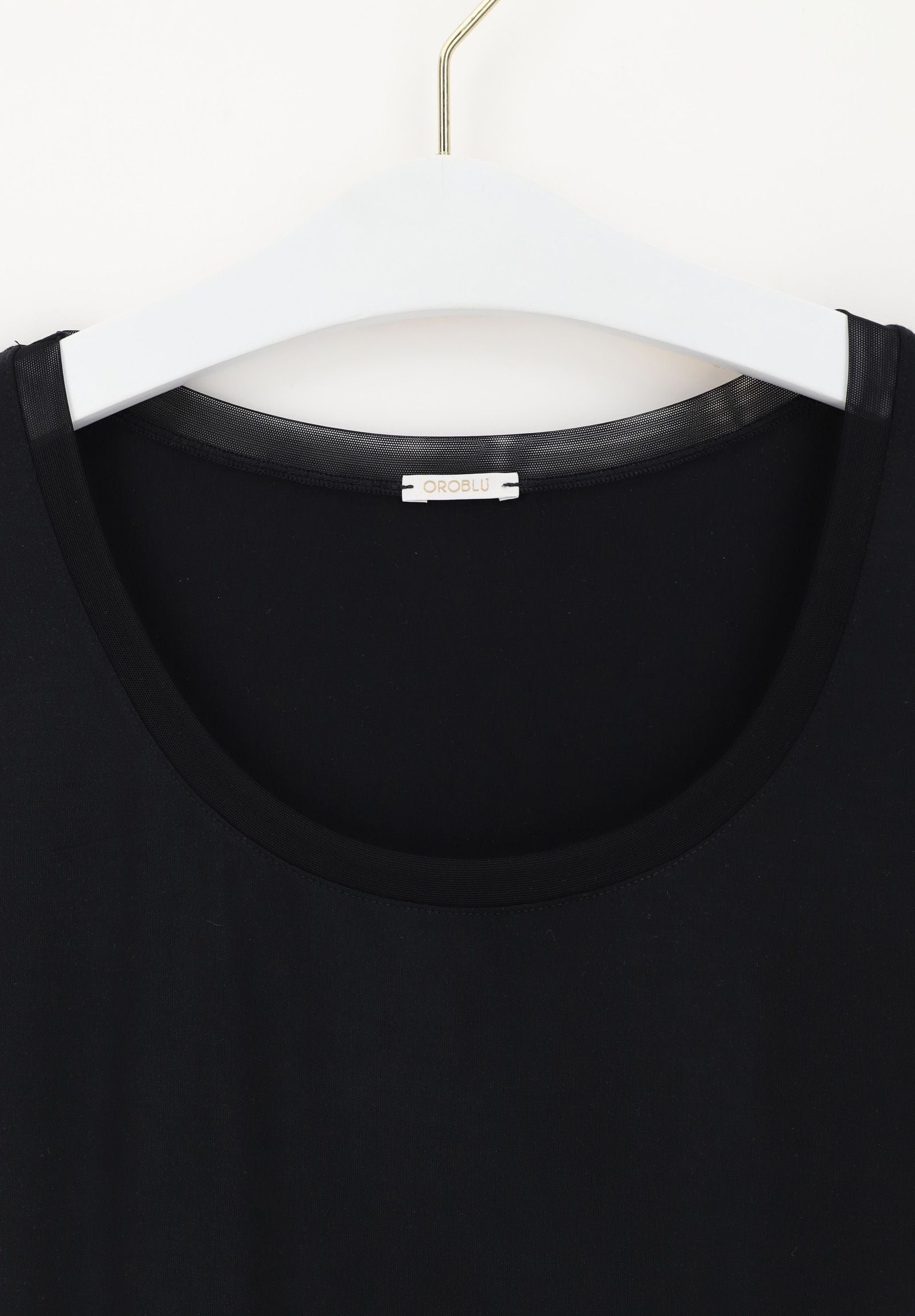 Perfetta sia come intimo che come capo esternabile, questa maglia è caratterizzata da un scollo profondo e manica corta. E’ realizzata in un leggero e morbido micromodal elasticizzato abbinato al tulle elasticizzato sullo scollo. La vestibilità è aderente.