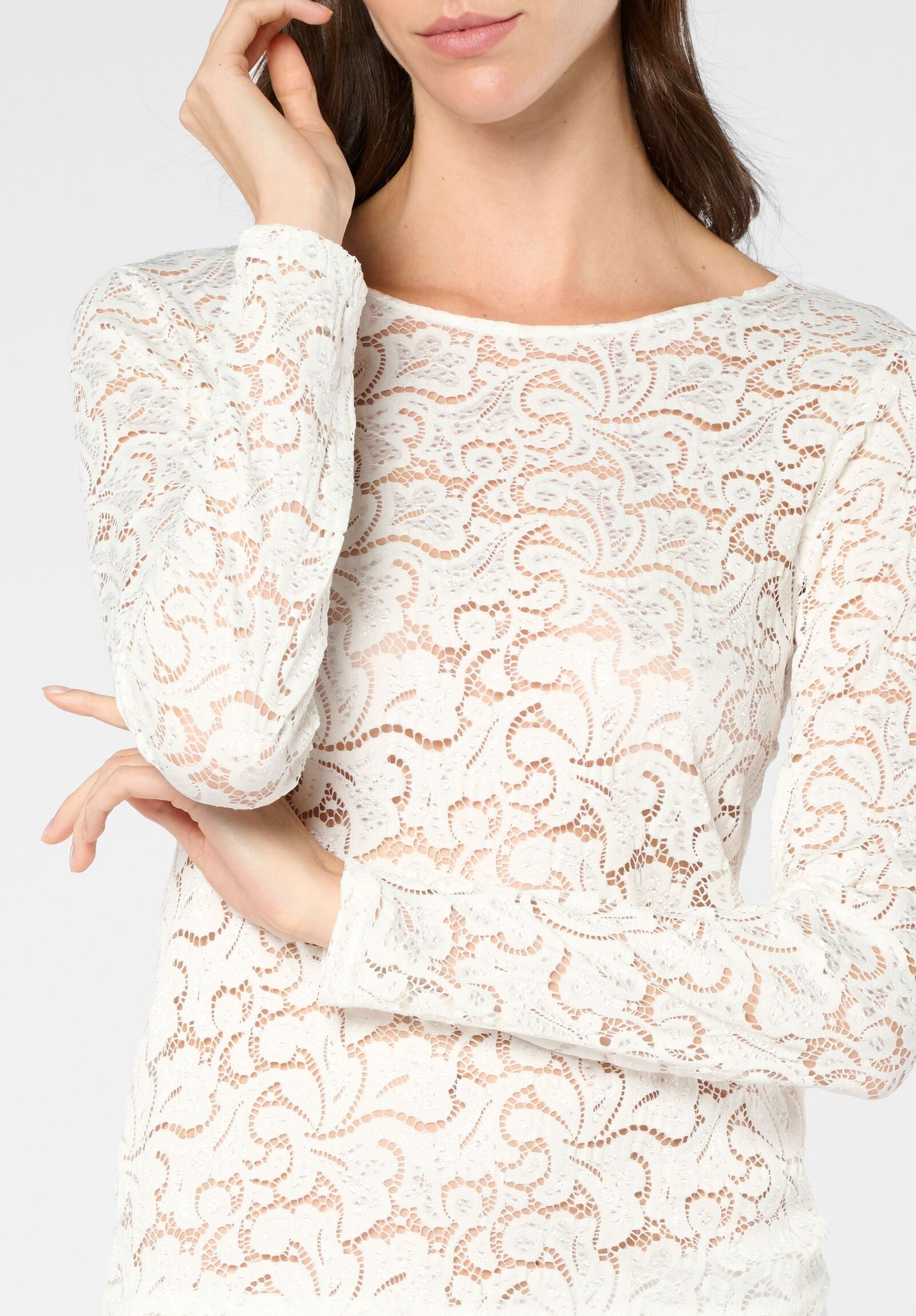 Maglia a maniche lunghe realizzata in raffinato pizzo, con scollo a barchetta. Le linee essenziali e la vestibilità impeccabile rendono questo capo confortevole ma allo stesso tempo estremamente elegante.Perfetta da indossare da sola per un look sofisticato o come sottogiacca per aggiungere un tocco femminile ai tuoi outfit