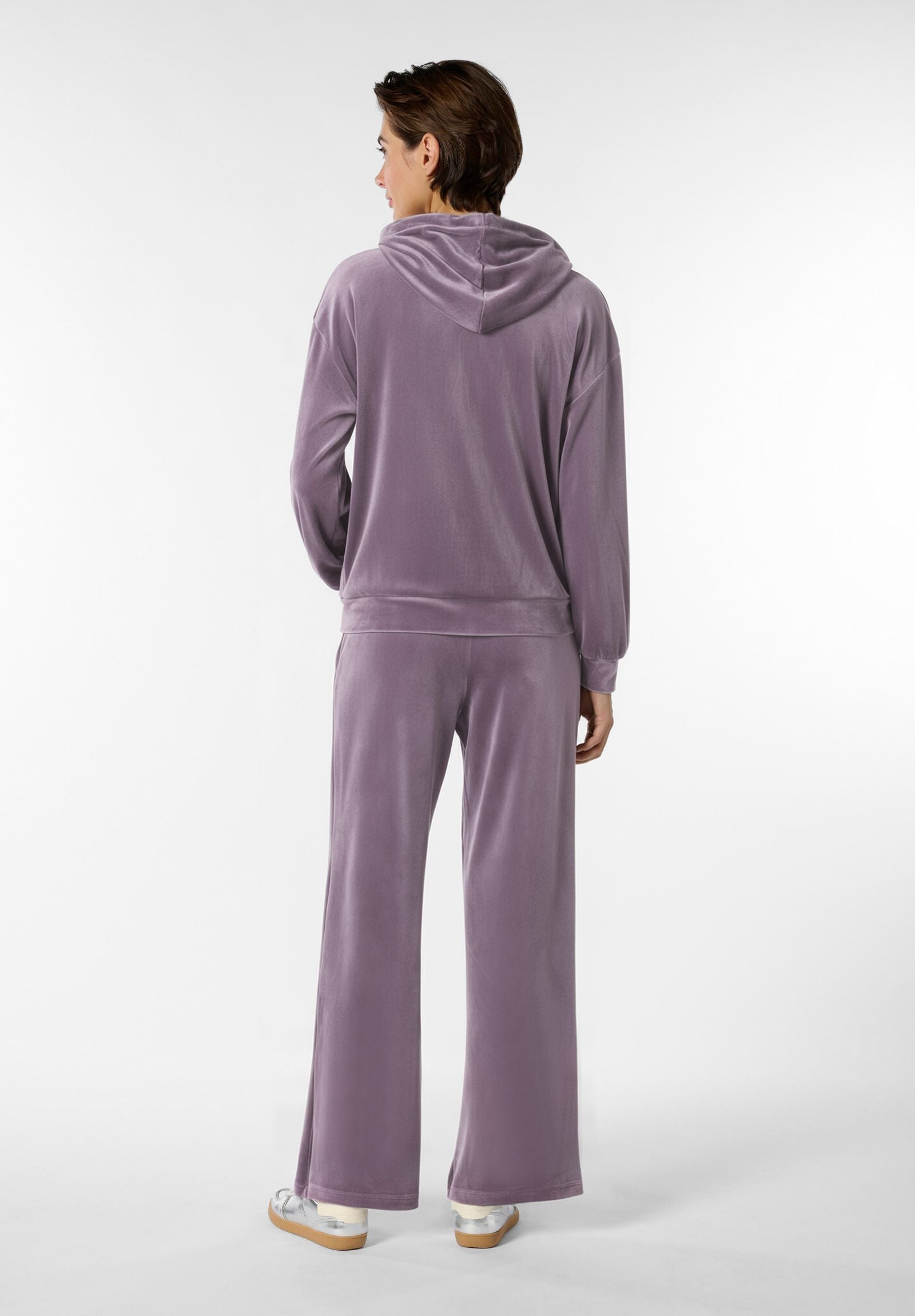 Tuta due pezzi in morbida ciniglia, pensata per offrire comfort e un tocco di eleganza anche nei momenti di relax. La giacca è dotata di zip frontale, cappuccio e tasche laterali, con una vestibilità pratica e avvolgente. I pantaloni presentano elastico in vita con coulisse regolabile e tasche laterali, per un look casual ma curato. Ideale per il tempo libero, i viaggi o semplicemente per coccolarsi con stile.