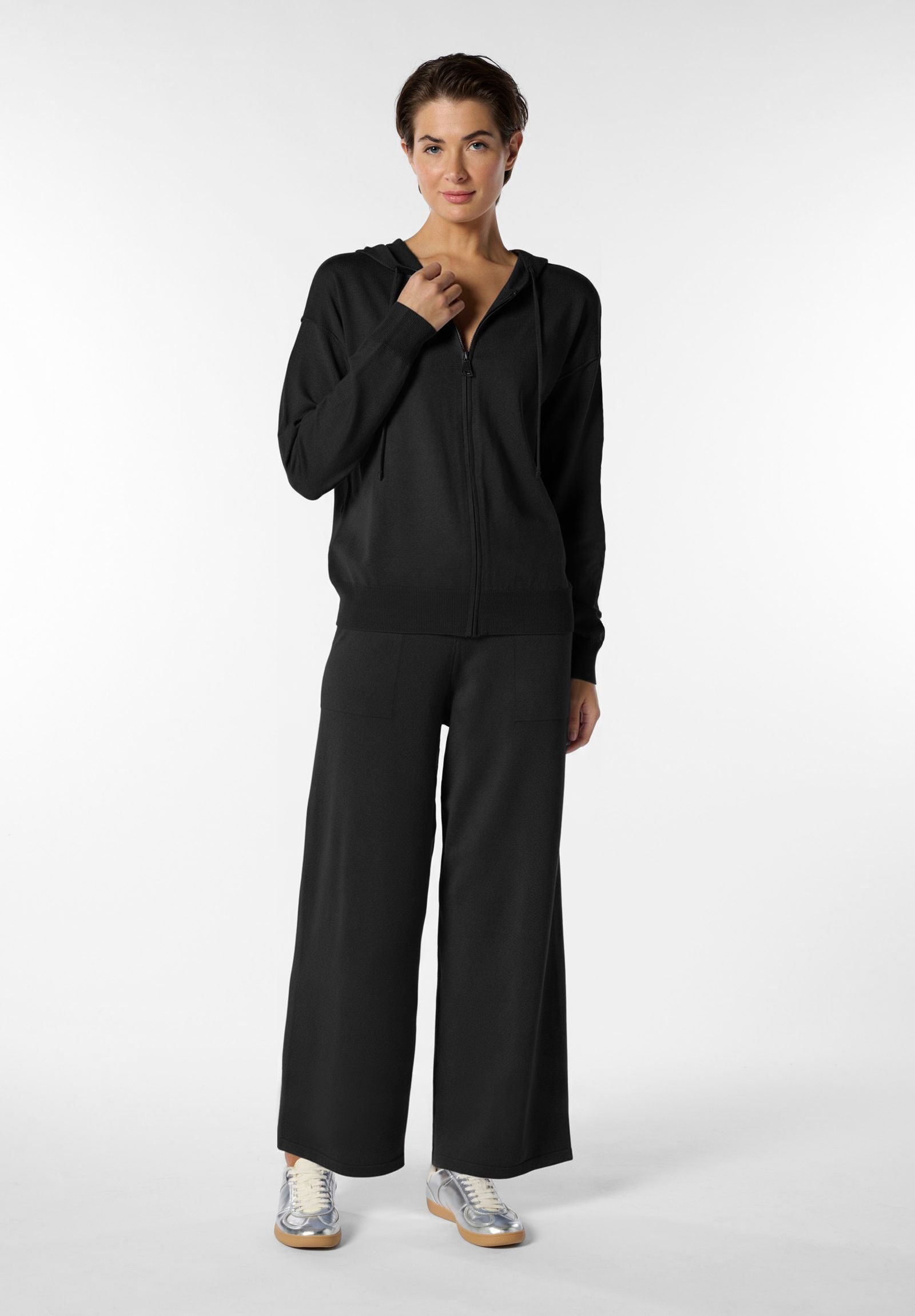 Tuta due pezzi realizzata in morbido filato a maglia di viscosa, ideale per chi cerca comodità senza rinunciare allo stile. La felpa, dal taglio confortevole, è dotata di cappuccio e zip frontale per un tocco sportivo e pratico. Il pantalone ampio con coulisse in vita e tasche a vista sui fianchi completa l’outfit con funzionalità e morbidezza. Un completo perfetto per il tempo libero, i momenti di relax o i look dinamici e contemporanei.